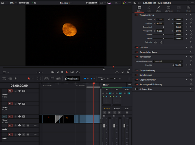 Astro-Videos gehen schneller von der Hand: Hier gibt es nicht allzu viel zu trimmen, der Ton ist bestenfalls Nebensache und Effekte werden spärlich eingesetzt. Leider zählt die in der Astronomie beliebte Rauschreduktion zu jenen Features, die der Bezahlversion DaVinci Studio vorbehalten sind.