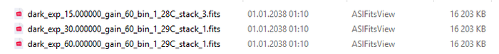Unter bias gibt es von Haus aus nur ein einziges File: bias_gain_2_bin_1.fits.Bei den Master-Flats stehen drei zur Auswahl, je nach Filter. Die abschließende Zahl vor der Kennung fits steht für diesen Filter: