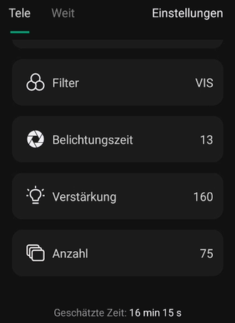 Dwarf analysiert die Sensortemperatur und fordert möglicherweise zum Erstellen neuer Darks (Dunkelbilder) auf. Ansonsten wählt man diese Option über einen Klick auf den Kreis mit den drei Punkten.Weil Dwarf passende Darks zum Erstellen gestackter Summenbilder benötigt, sollte man diesen Prozess nach Möglichkeit vor dem Schießen der Lights anstoßen.Die Darkframes ("Darks", Dunkelbilder) müssen die gleiche Sensortemperatur, Belichtungszeit und Verstärkung aufweisen wie die Lightframes ("Lights", Objektfotos). Weicht auch nur ein einziger der drei Paramater deutlich ab, sollten neue Darks geschossen werden.Daher empfiehlt es sich für den Anfang, auch die Lights immer mit gleicher Belichtungszeit und Verstärkung (z.B. 30 sec mit Gain 60) zu schießen. Somit bleibt bloß die kaum steuerbare Temperatur als Variable. Die Filtereinstellung ist hier übrigens egal.
