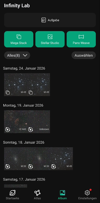 Vielleicht haben Sie das selbe Himmelsobjekt in zwei oder mehreren Belichtungsserien erfasst - zum Beispiel, weil Ihnen die eingestellte Zahl an Lightframes letztlich doch zu gering vorkam. Bei äquatorialer Aufstellung können aber auch Stunden oder Tage zwischen den Serien verstreichen.Wählen Sie Mega Stack, erscheinen die Symbolbilder solcher Serien nebeneinander - zum Auswählen. Allerdings klappt das nicht, falls unterschiedliche Filter in Verwendung standen. Offenbar sollte man auf idente Einstellungen achten.Klickt man die Schaltfläche Gestapelt an, werden alle Lightframes dieser Serien zu einem neuen Summenbild vereint. Das verbessert das SNR, das Signal-zu-Rauschen-Verhältnis. Nach mehreren Minuten landet das Endergebnis wieder in der Systemgalerie. Um es in den PC zu bekommen, siehe oben: Verfahren C).