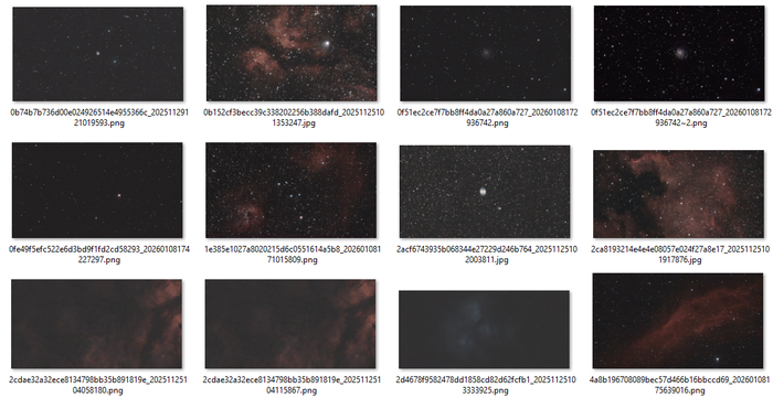 Die Namen der gelungenen Lights starten mit der Objektbezeichnung, gefolgt von der Belichtungszeit, der Verstärkung, dem Filter, dem Datum, der Uhrzeit und der Sensortemperatur. Z.B.: M 33_60s40_Astro_20260118-210418558_14C.fitsDiese Dateien werden heruntergeladen und dann als Lightframes in ein Stacking-Programm wie DeepSkyStacker geladen.Ebenfalls im Ordner Astronomy findet sich der Folder CALI_FRAME mit Kalibrierungsaufnahmen. Es sind jeweils Masterfiles, um das Rauschen von Einzelbildern weg zu mitteln. Darin gibt es die Ordner bias, dark und flat. Innerhalb dieser Folder existieren jeweils wieder Ordner wie cam_0 und cam_1. Dabei wählt man