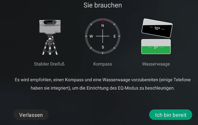 Voraussetzung ist letztlich weder das eine noch das andere. Es klappt damit nur rascher. Denn das Dwarf kontrolliert die Genauigkeit der Ausrichtung selbständig am Sternenhimmel, sobald man in den äquatorialen Modus wechselt.Die Dwarf-App gibt dem Anwender dann entsprechende Anweisungen, um die Winkel beider Achsen bis auf 1 Grad genau einzurichten!Man montiert das Dwarf 3 jedenfalls so, dass die Anschlussbuchse im Fuß des Geräts nach Osten zeigt, das Dwarf-Logo nach Süden. Die beiden Punkte auf der Rückseite des Fußes sowie des Gehäuses stehen übereinander im Norden.