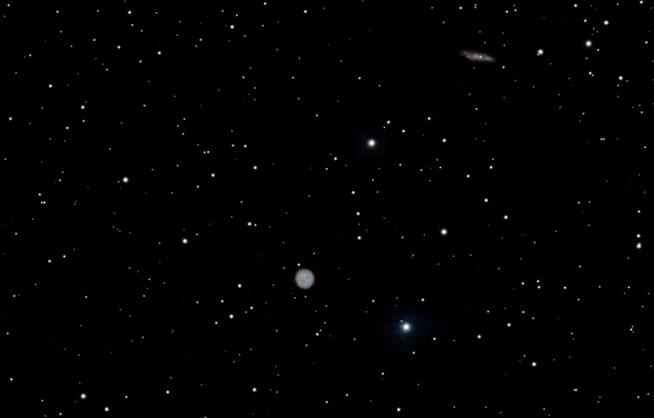 M97 (nahe Bildmitte) und M108 (r.o.) - von Stellar Studio automatisch gestackt und virtuell bearbeitet. Kontrast und Hintergrundschwärze wurden von mir manuell verstärkt
