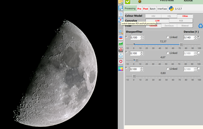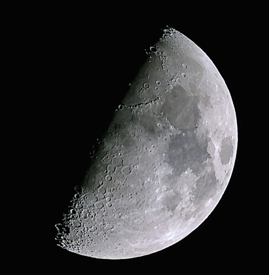 Beim Schärfen muss man einen erträglichen Kompromiss suchen: Ist man zu konservativ, gehen Details verloren. Übertreibt man, wirken manche Strukturen gekünstelt. Im Bild oben schauen Krater recht gut aus, dafür bekamen Mondmeere aber schon einen gemäldeartigen Touch.Mondmeere und Krater besitzen den selben Ursprung, entstanden alle beim Einschlag von Himmelskörpern. Die Meere entstammen besonders heftigen Impakten und wurden mit hochsteigendem Magma aus dem Mondinneren gefüllt. Wegen der leicht differierenden Zusammensetzung der Lavadecken sehen wir unterschiedliche Schattierungen von Grau. Die Fotografie hält außerdem Farbnuancen fest: Andeutungsweise gelingt dies auch dem Dwarf.