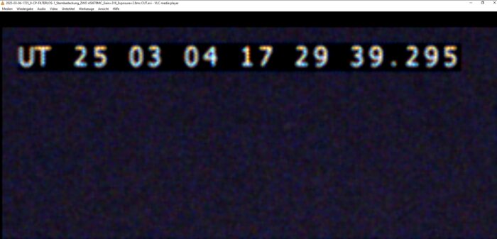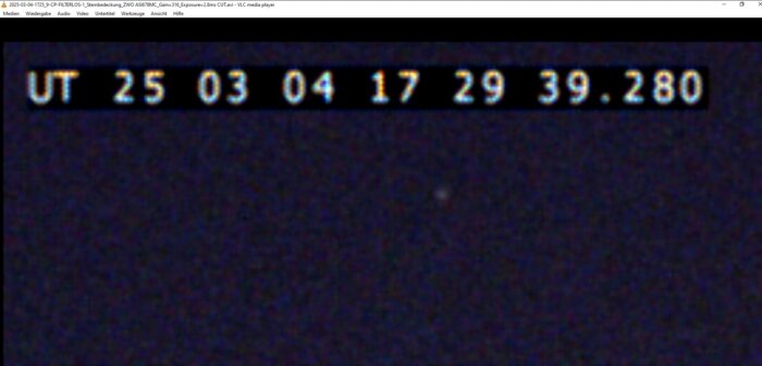 - Bei Verwendung solcher Software muss man die entsprechenden, interessantesten Stellen selbst auswählen - das trifft auch beim Filmen von Sternbedeckungen (Video oben) zu. Blendet man die Systemzeit bei der Aufnahme ein, so ist die Aufnahmezeit der entsprechenden Frames sofort ersichtlich. Man leitet daraus ab, wann der Stern tatsächlich am dunklen Mondrand verschwunden ist.