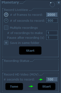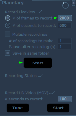 Die Funktion Planetary in APT speichert die über den LiveView einströmenden Bilder als Serie von JPGs. Die Zahl ist wählbar, z.B. 2000 (siehe Grafik rechts unten). Nach dem Drücken von "Start" werden diese Bilder in einem Ordner namens LV kreiert. Sie sind vergleichsweise klein, in meinem Fall messen sie 1056 x 704 Pixel.