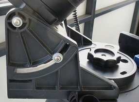 Leider hat eine solche Polhöhenwiege auch Nachteile. Sie erhöht das Gewicht des Geräts merklich und bringt den Tubus in meinem Fall näher an die Balkondecke heran. Das wiederum schränkt das überblickbare Himmelsareal noch weiter ein.Foto rechts: Polhöhenwiege an meinem LX90
