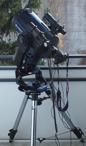 Außerdem wird das Teleskop damit so ausladend, dass es beim Überwinden des Türstaffels - das geschieht Bein für Bein und somit mit wechselnder Neigung - seitlich am Türstock anschlägt.Foto rechts: Früher betrieb ich das LX90 im äquatorialen AufstellungsmodusDeshalb ziehe ich schweren Herzens den altazimutalen Montierungsmodus vor.Bei Belichtungen von jeweils maximal 15 s fällt die erwähnte Bildfelddrehung trotz einer Brennweite von über 2.000 mm nicht auf.Allerdings wehrt die Montierung in diesem Modus sämtliche Autoguiding-Befehle ab.