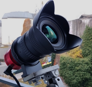 Das Foto links zeigt die Asi 678MC mit Omegon Adapter und dem Objektiv Tokina 11-16 mm (Canon-Bajonett), montiert am Fotostativ. Äquivalentbrennweite: 54-78 mm