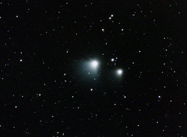 Die Abbildung von Emissionsnebeln ist dank des wahlweise einschaltbaren Duo-Band-Filters hervorragend und wesentlich besser, als ich es als Stadtbewohner zu hoffen gewagt hatte. Die handliche Dimension des Instruments erlaubt es mir, den Nachthimmel auch in Nordostrichtung abzulichten - wohin mein Teleskop am südwestseitigen Balkon nicht blicken kann.Ein Wermutstropfen ist jedoch die Abbildung heller Sterne, die zumindest bei meinem Dwarf von Beginn an aussahen, als würden sie - einem Suchscheinwerfer gleich - nach links unten strahlen. Das Problem tritt bei jeder Filtereinstellung im Telebereich auf, und auch ganz unabhängig von der Position des Sterns am Foto. Bei schwächeren Sternen liegt es unterhalb der Wahrnehmungsgrenze. Längere Belichtung lässt diese Sternchen heller erscheinen - bis die störende Erscheinung abermals auftaucht.Im folgenden sehen Sie Mizar und Alkor, geräteintern gestackt. Doch mit dem Stacking hat der optische Fehler nichts zu tun, da er auch auf den einzelnen Lightframes zu erkennen ist. Auf einigen Emissionsnebelfotos dieser Seite werden Sie ihn ebenfalls entdecken. Das dämpft meinen Enthusiasmus für den Dwarf, zumal es nicht immer möglich ist, hellere Sterne außerhalb des Bildfelds zu halten.