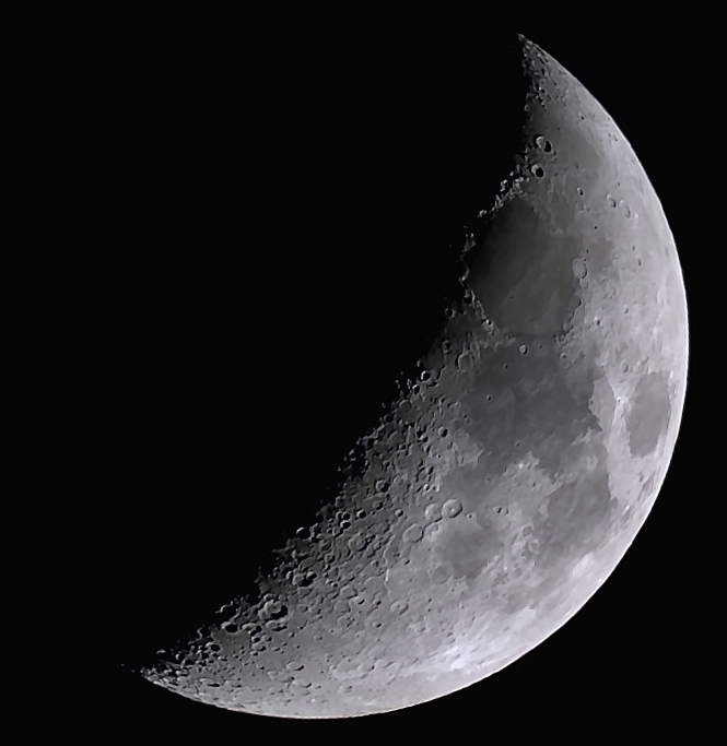Beim Schärfen muss man einen erträglichen Kompromiss suchen: Ist man zu konservativ, gehen Details verloren. Übertreibt man, wirken manche Strukturen gekünstelt. Im Bild oben schauen Krater recht gut aus, dafür bekamen Mondmeere aber schon einen gemäldeartigen Touch.Mondmeere und Krater besitzen den selben Ursprung, entstanden alle beim Einschlag von Himmelskörpern. Die Meere entstammen besonders heftigen Impakten und wurden mit hochsteigendem Magma aus dem Mondinneren gefüllt. Wegen der leicht differierenden Zusammensetzung der Lavadecken sehen wir unterschiedliche Schattierungen von Grau. Die Fotografie hält außerdem Farbnuancen fest: Andeutungsweise gelingt dies auch dem Dwarf.
