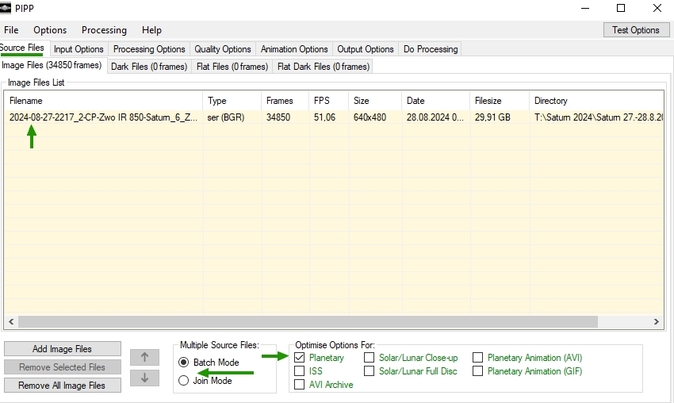 Ein Programm, das die Kanäle von Videos trennt, ist PIPP.Das Video wird dort in den Reiter Source Files gezogen. Sind es mehrere, lassen sich diese in einem Ruck bearbeiten (Batch Mode) oder auch miteinander verbinden (Join Mode). Unter Optimise Options for sollte bei Planetenvideos Planetary ausgewählt sein, bei Detailaufnahmen der Mondoberfläche hingegen Lunar Close-up.