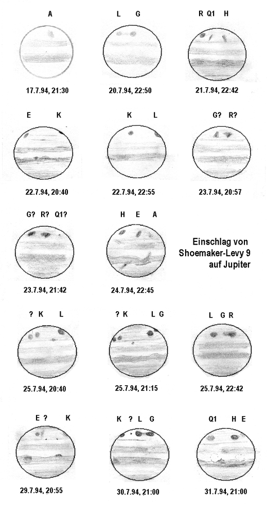 Die Einschlagsblitze selbst wurden meiner Erinnerung nach damals nicht beobachtet, zumal alles auf der erdabgewandten Jupiterseite geschah. Stunden später rotierten die Impaktregionen aber über Jupiters Rand: Runde dunkle Flecken verrieten sie.