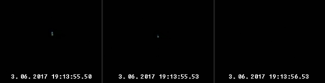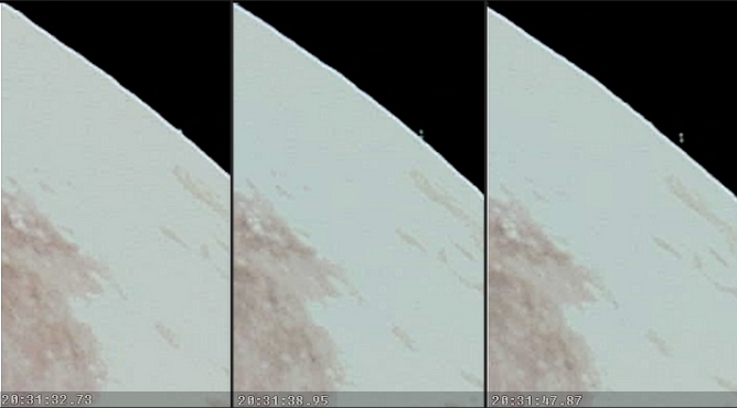 Aus dem Video wurden mehrere Frames extrahiert. Die folgenden drei dokumentieren das Verschwinden der beiden Komponenten am (hier nicht sichtbaren) unbeleuchteten Mondrand.
