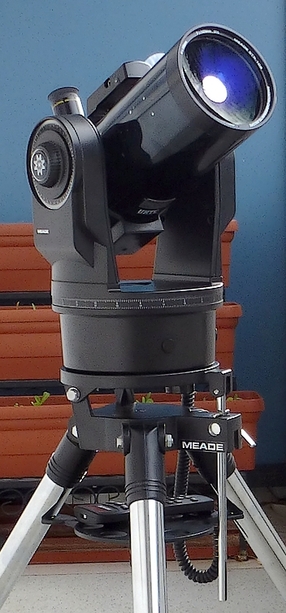Außerdem wird das Teleskop damit so ausladend, dass es beim Überwinden des Türstaffels - das geschieht Bein für Bein und somit mit wechselnder Neigung - seitlich am Türstock anschlägt.Foto rechts: Früher betrieb ich das LX90 im äquatorialen AufstellungsmodusDeshalb ziehe ich schweren Herzens den altazimutalen Montierungsmodus vor.Bei Belichtungen von jeweils maximal 15 s fällt die erwähnte Bildfelddrehung trotz einer Brennweite von über 2.000 mm nicht auf.Allerdings wehrt die Montierung in diesem Modus sämtliche Autoguiding-Befehle ab.