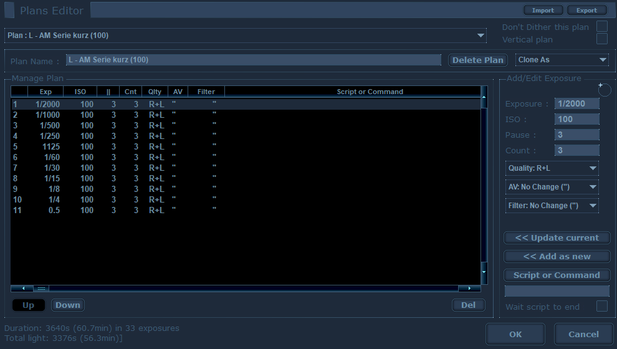 Ist die Cam an PC oder Notebook angeschlossen, übernimmt die Aufnahmesoftware die Belichtungssteuerung - wie z.B. die EOS Utility oder APT. In APT lassen sich komplexe Pläne mit völlig unterschiedlichen Belichtungszeiten und ISO-Einstellungen definieren (siehe Foto). So erhält man den flexibelsten aller Timer.
